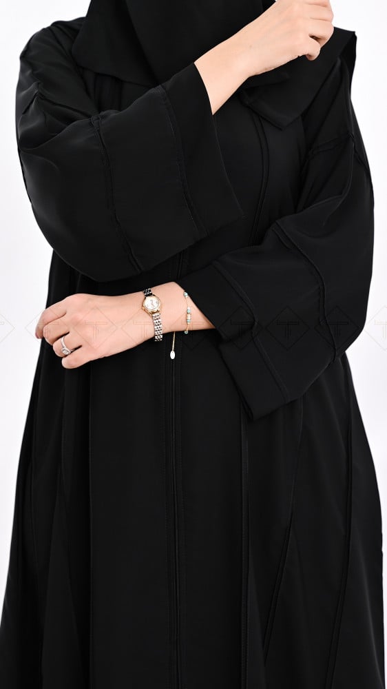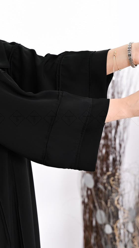 عباية كتف سوداء بكسرات على طول العباية من الأمام والخلف بكم مربع عليه طق طق وكسرات عرضية قماش العباية حرير نواعم .